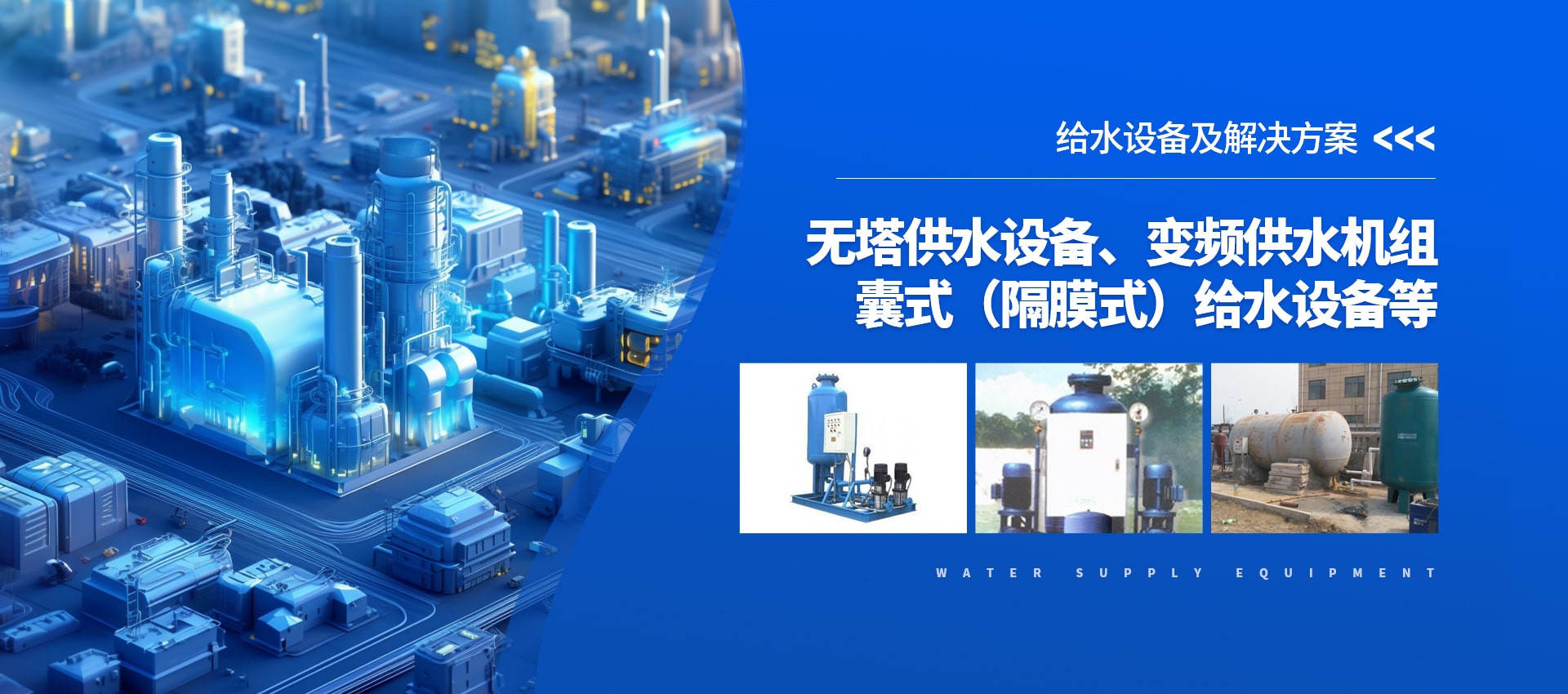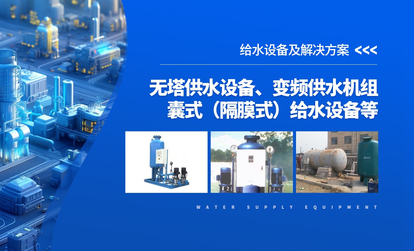 給水設(shè)備——無(wú)塔供水設(shè)備、變頻供水機(jī)組、囊式(隔膜式)給水設(shè)備、 無(wú)負(fù)壓供水設(shè)備。